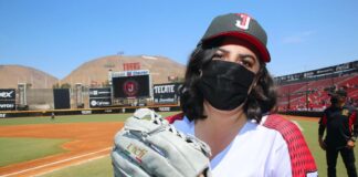 LANZA KARLA PATRICIA RUIZ BOLA CONMEMORATIVA EN JUEGO DE BEISBOL
