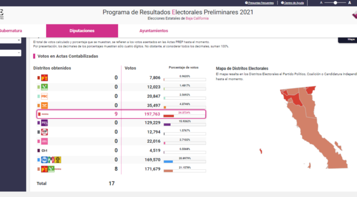 TIJUANA BC, 08 de Junio 2021.- La marca de MORENA sigue vigente aún en Baja California, ya que, en este proceso electoral del 06 de junio ganó prácticamente los 17 distritos electorales del estado.
