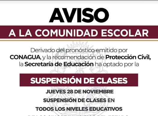 Con base en la recomendación de la Dirección de Protección Civil de Baja California y el pronóstico climatológico de la Comisión Nacional del Agua, la Secretaría de Educación informa de la suspensión de clases el día jueves 28 de noviembre en todos los niveles educativos (escuelas públicas y privadas) para todos los municipios del Estado.
