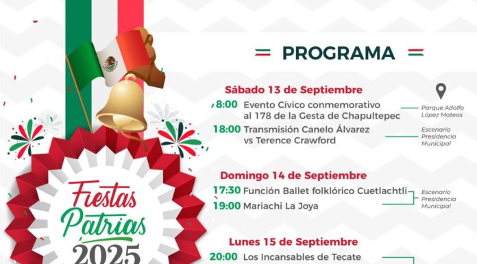 TECATE BC, 11 de septiembre de 2025.- El Gobierno de Tecate, invita a todas las familias tecatenses a disfrutar de un gran ambiente de música, cultura y tradición en las Fiestas Patrias 2025, que se llevarán a cabo del...