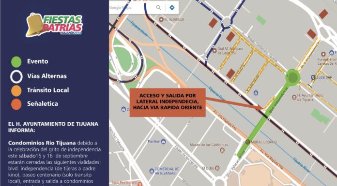 Con motivo de los festejos por el Grito de Independencia 2018, la Dirección de Relaciones Públicas del XXII Ayuntamiento de Tijuana, informa que se encontrarán cerradas vialidades en el área del bulevar Independencia, principalmente las calles aledañas al Palacio Municipal, como el Paseo Centenario de manera parcial y el Puente Independencia de manera total.