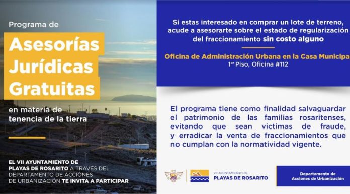 El VII Ayuntamiento de Playas de Rosarito, a través del Departamento de Acciones de Urbanización invita a la ciudadanía en general interesada en la adquisición de propiedades en el municipio, acercarse a las oficinas donde se brindan asesorías legales de forma gratuita, para así evitar ser víctimas de fraude en la compra de bienes.