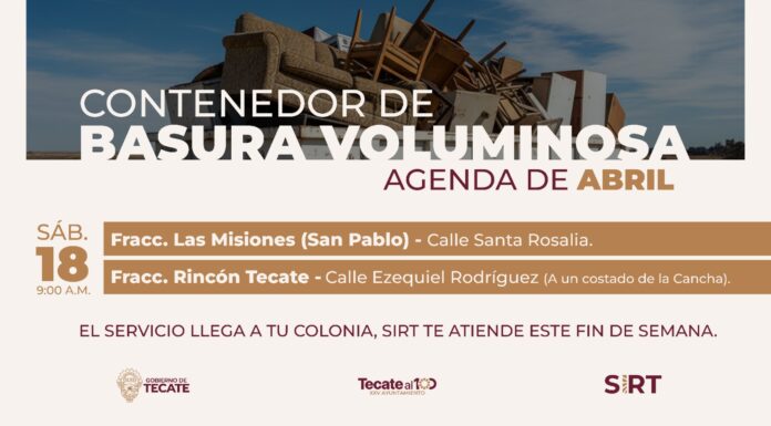 TECATE BC, 16 de abril de 2026.– El Gobierno de Tecate, a través de Servicios Integrales de Residuos de Tecate (SIRT), informa a la comunidad sobre la instalación de contenedores para la disposición de basura voluminosa este sábado 18...