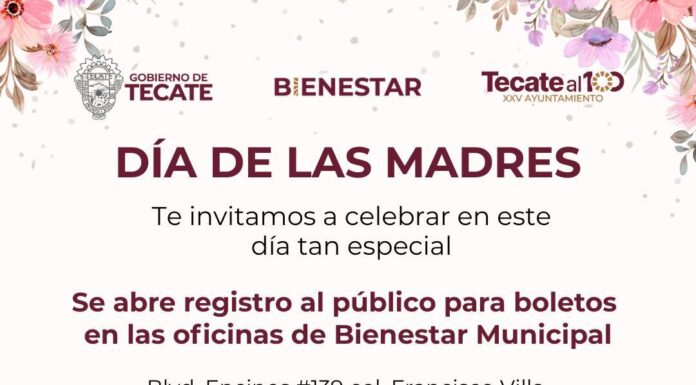 TECATE BC, 12 de mayo de 2025.– En el marco del Día de las Madres, el Gobierno de Tecate, a través de la Dirección de Bienestar Municipal, lanza una convocatoria abierta al público para registrarse y obtener boletos para...