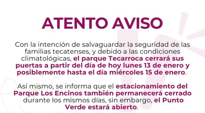 **Tanto el parque Tecarroca como el estacionamiento del parque Los Encinos estarán cerrados este lunes 13 de enero y posiblemente hasta el miércoles 15 de enero