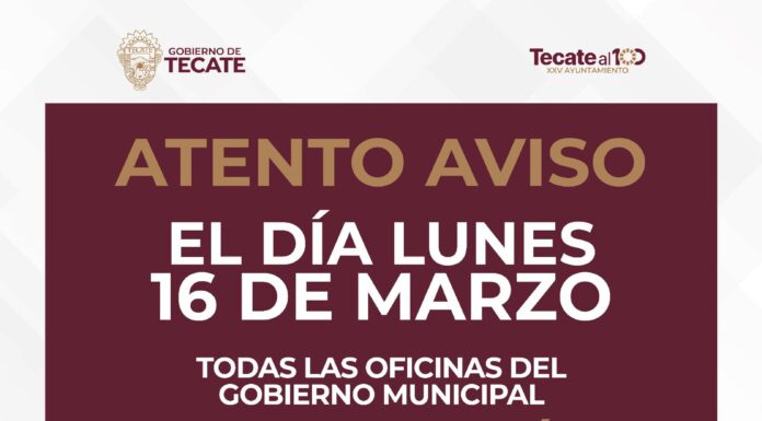 TECATE BC, 13 de marzo de 2026.– El Gobierno de Tecate informa a la ciudadanía que el próximo lunes 16 de marzo todas las oficinas del Gobierno Municipal permanecerán cerradas, con motivo de la conmemoración cívica correspondiente a esta...