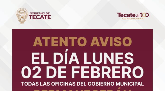 TECATE BC, 29 de enero de 2026.- El Gobierno de Tecate informa a la comunidad que, las oficinas municipales permanecerán cerradas el próximo lunes 02 de febrero, en conmemoración de la promulgación de la Constitución Política de los Estados...