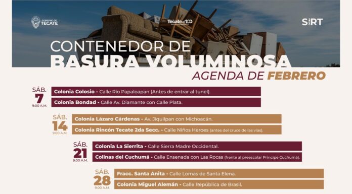 TECATE BC, 06 de febrero de 2026.- La unidad de Servicios Integrales de Residuos de Tecate (SIRT) presentó la agenda correspondiente al mes de febrero del programa Contenedor de Basura Voluminosa, una acción que facilita a la ciudadanía la...