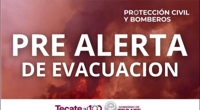 TECATE BC, 27 de junio de 2025.- El Gobierno de Tecate, a través de la Coordinación Municipal de Protección Civil y Bomberos, informa a la comunidad que se ha emitido una pre alerta de evacuación debido al incendio forestal...