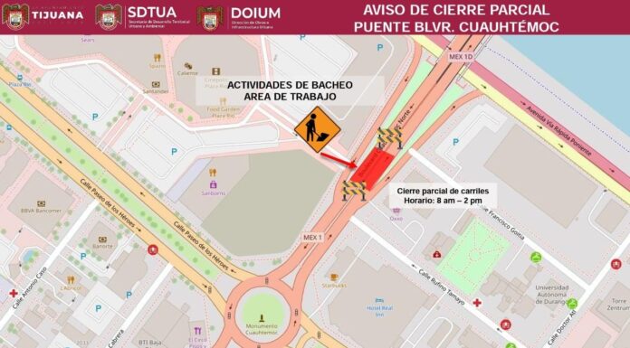 TIJUANA....- Debido a los trabajos de bacheo que se llevarán a cabo en el puente bulevar Cuauhtémoc, a partir del día lunes 26 de diciembre se realizará un cierre parcial en la vialidad desde las 8:00 de la mañana.