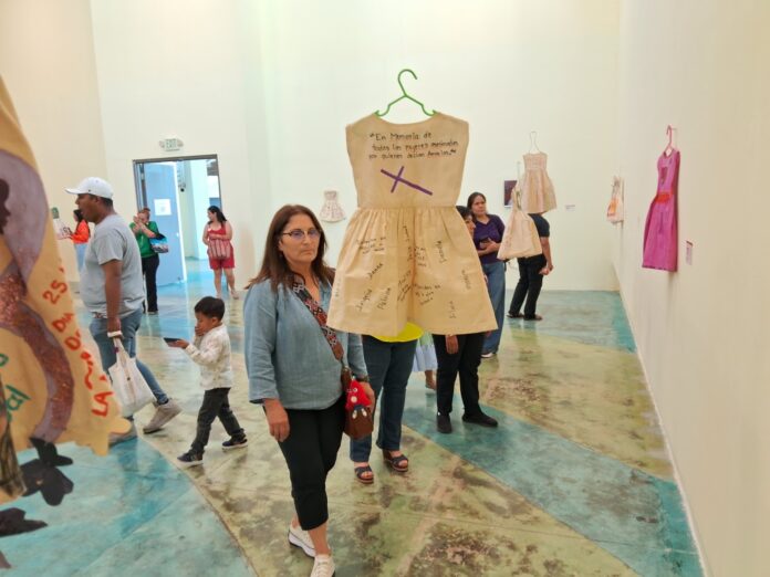 PLAYAS DE ROSARITO BC, 25 de agosto de 2024. – La exposición colectiva “Vestido Naranja”, una intervención artística sobre textil que hace denuncia pública a la violencia cotidiana, con la participación de 42 mujeres artistas en diversas disciplinas, de Mexicali, Playas de Rosarito, Tijuana, Ensenada y Caborca, Sonora, fue inaugurada en el Centro Estatal de las Artes del quinto municipio de Baja California.