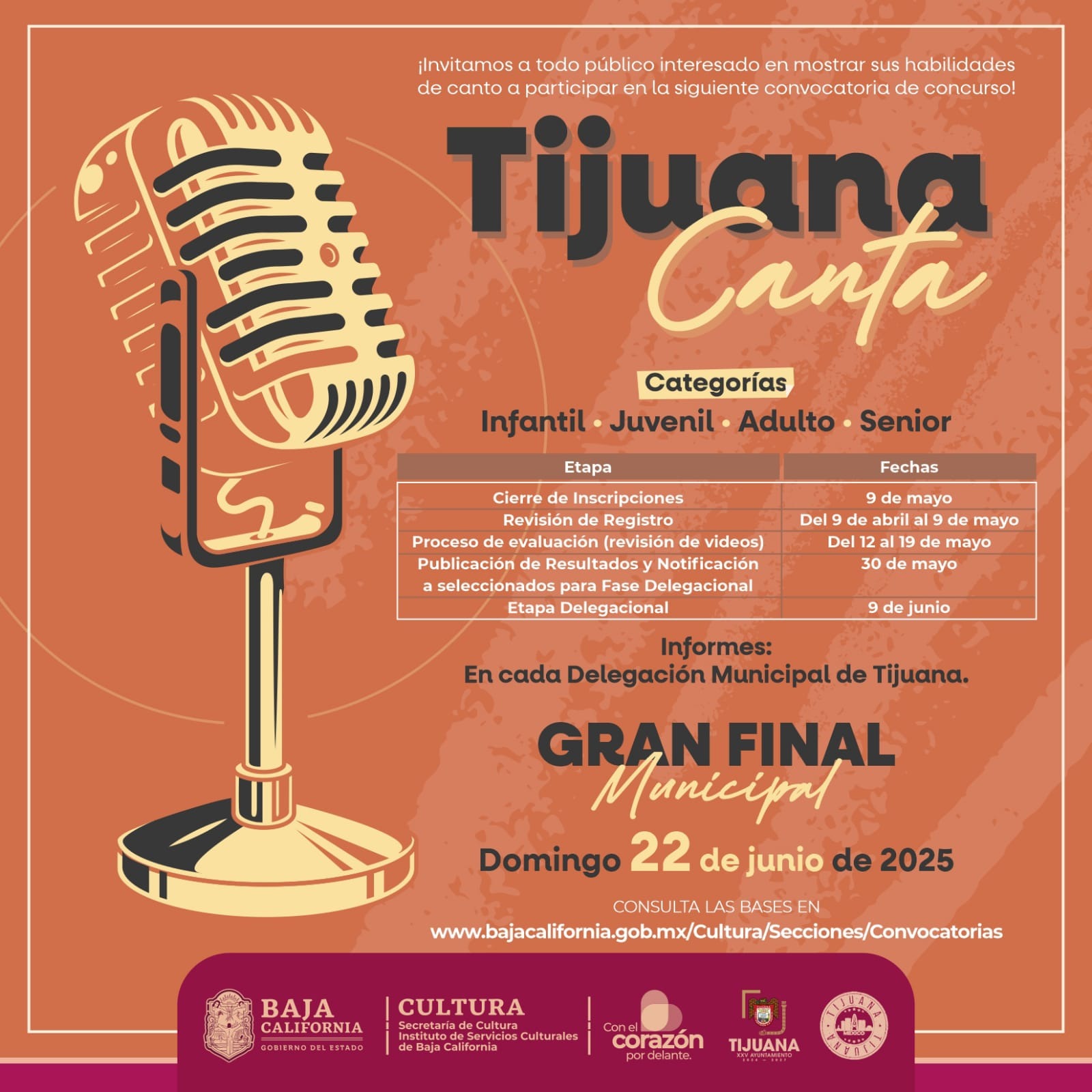 TIJUANA BC, 09 de abril de 2025. – Con el objetivo de fortalecer las plataformas y espacios que promueven el talento de la entidad para potenciar nuestra identidad cultural, la Secretaría de Cultura de Baja California, que preside Alma Delia Ábrego Ceballos, en coordinación con el XXV H. Ayuntamiento de Tijuana a través de sus delegaciones municipales convocan a participar en el concurso “Tijuana Canta”.