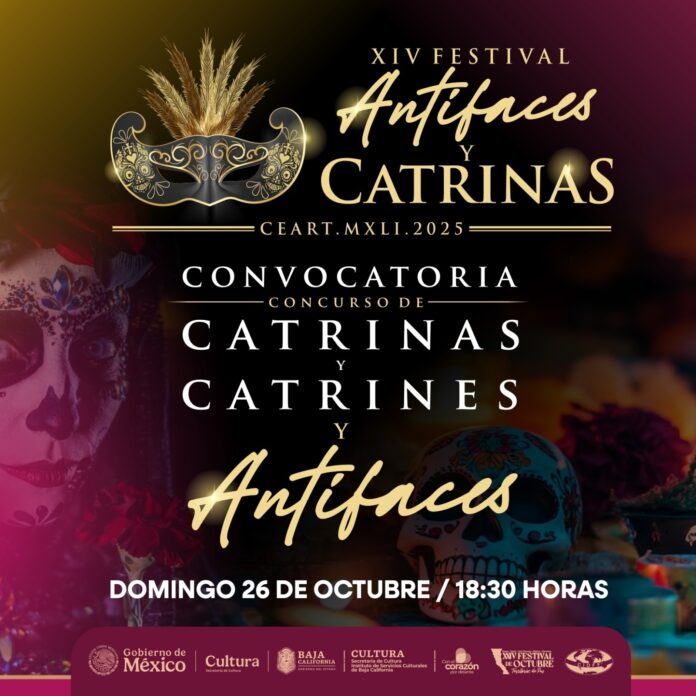MEXICALI BC, 21 de octubre de 2025. – El Instituto de Servicios Culturales de Baja California, a través del Centro Estatal de las Artes (CEART) Mexicali, convoca a participar en los concursos de Antifaces y Catrinas y Catrines Vivientes, que se llevarán a cabo durante el XIV Festival “Antifaces y Catrinas”, en el marco de la celebración del Día de Muertos.