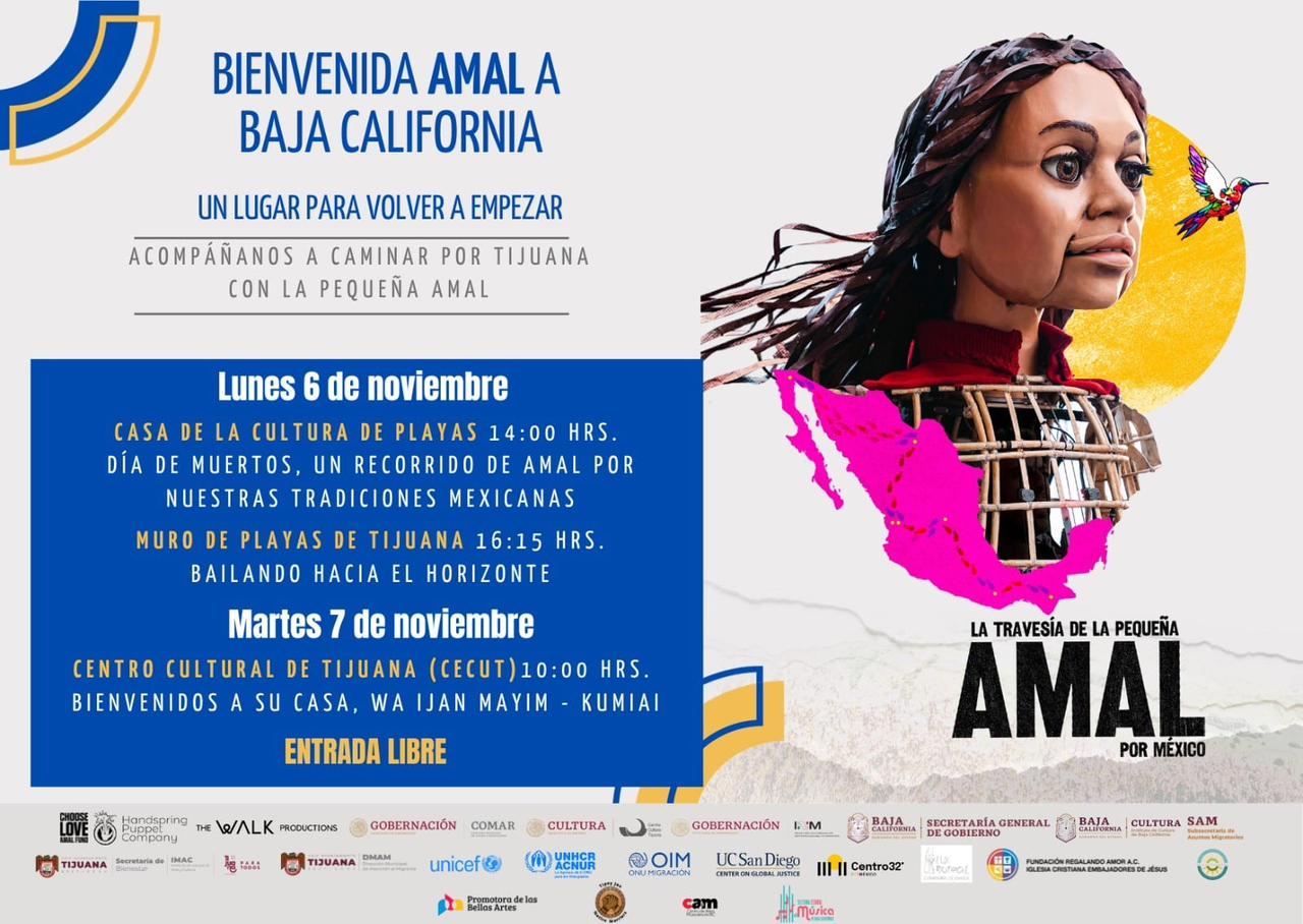 TIJUANA BC, 03 de noviembre de 2023.- El próximo lunes 6 de noviembre, el Instituto Municipal de Arte y Cultura (IMAC) y la Agencia de la ONU para Refugiados (ACNUR) darán la bienvenida a la Pequeña Amal, la marioneta gigante de 3.6 metros que recorre el mundo con un mensaje sobre la migración, misma que visitará la Casa de Cultura de Playas de Tijuana, como primer punto en su peregrinaje por América Latina.