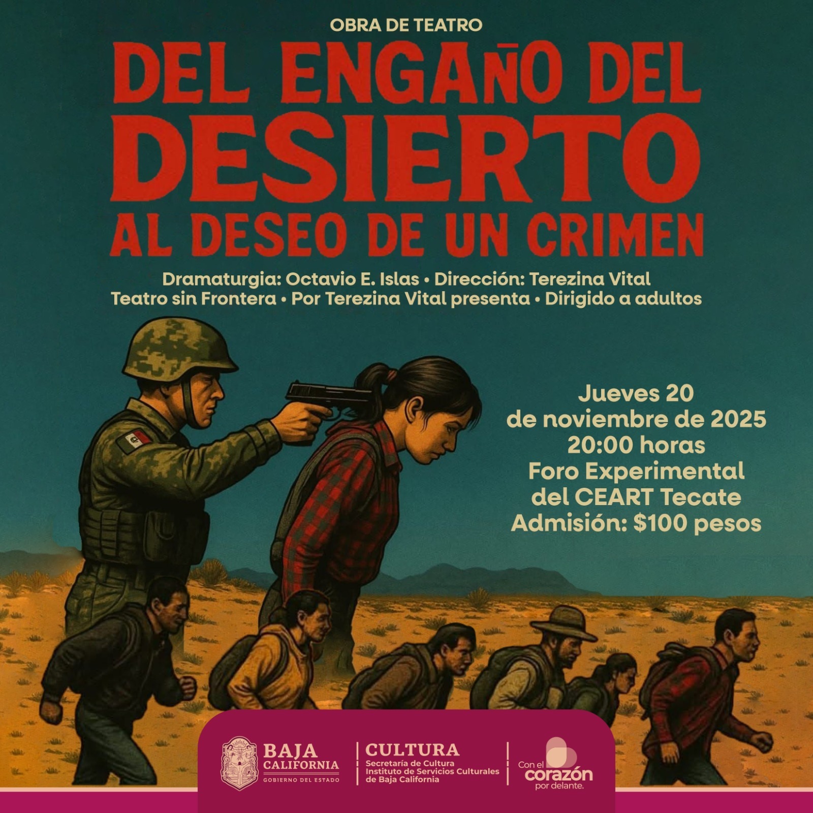 El jueves 20 de noviembre a las 20:00 horas se presentará la obra de teatro Del Engaño del Desierto al Deseo de un Crimen, una propuesta dramatúrgica de Octavio E. Islas bajo la dirección de Terezina Vital. Dirigida a un público adulto, esta pieza explora los límites del deseo y el engaño en un contexto cargado de tensión y suspenso. La entrada es de $100 pesos.