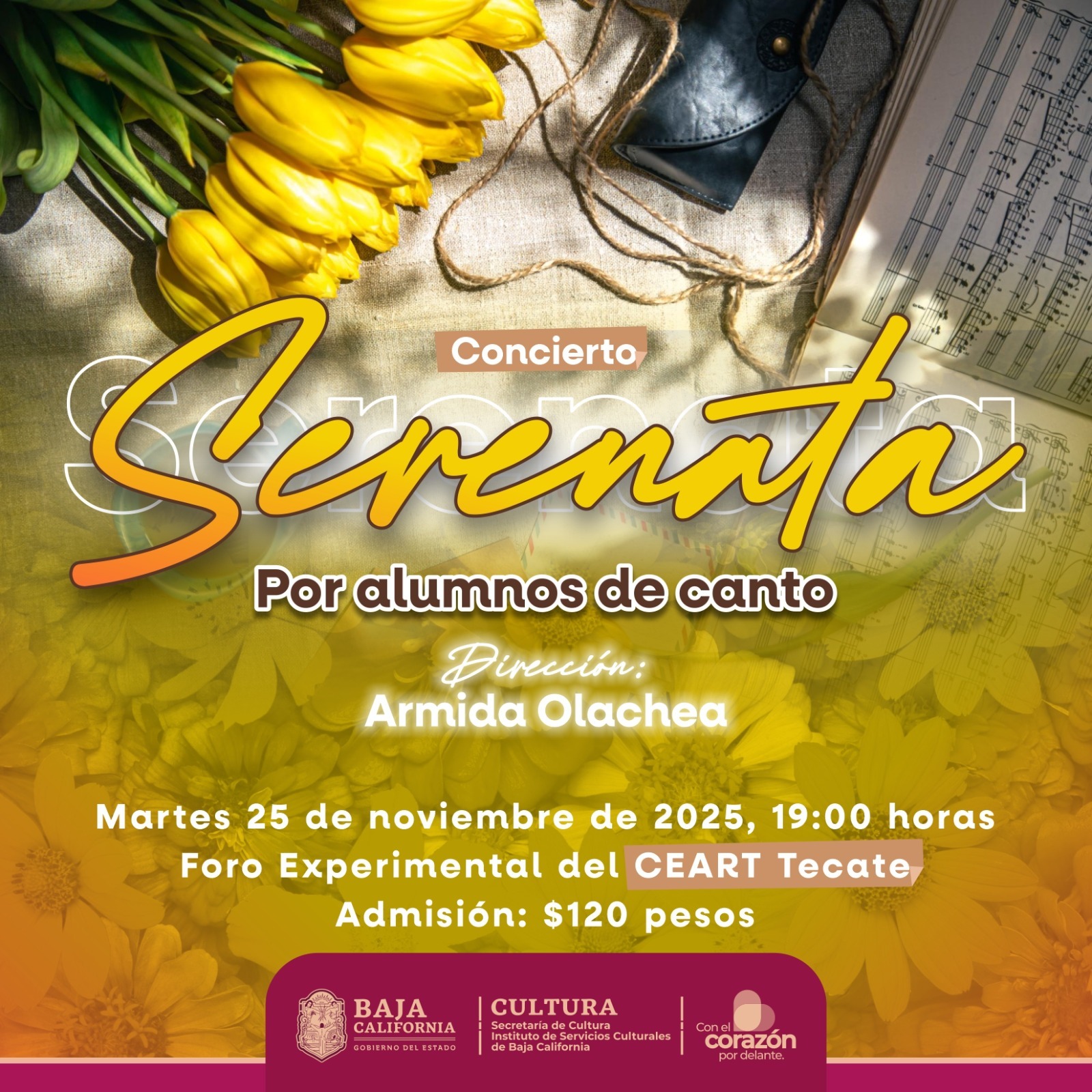 Posteriormente, el miércoles 25 de noviembre a las 19:00 horas se presentará el Concierto Serenata, con la participación de alumnos de canto dirigidos por Armida Olachea. Los jóvenes intérpretes ofrecerán una delicada selección de canciones que reflejan su talento y formación artística. El costo de entrada será de $120 pesos.
