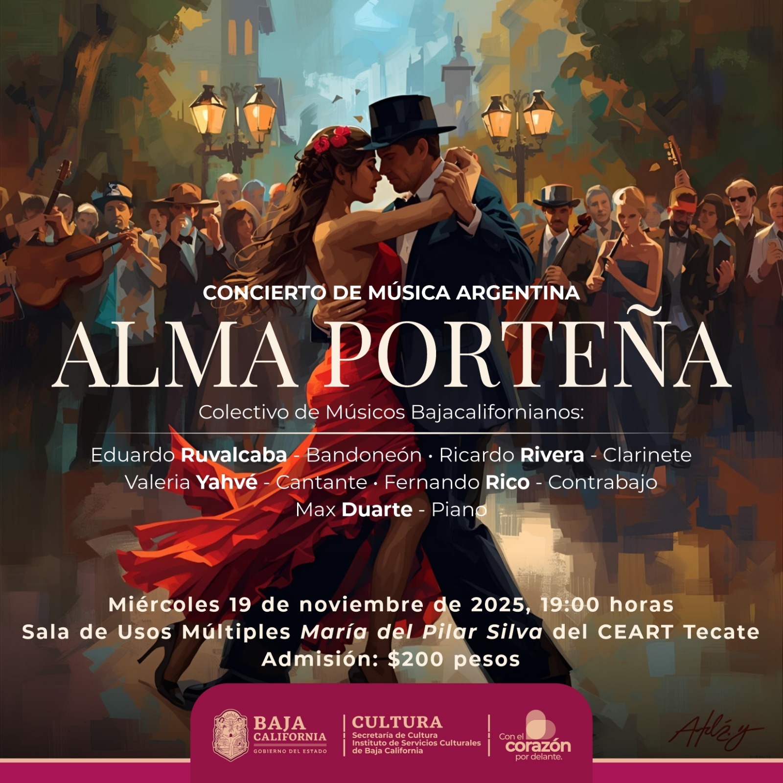 El miércoles 19 a las 19:00 horas se llevará a cabo el Concierto de música argentina Alma Porteña, a cargo del Colectivo de Músicos Bajacalifornianos. Este evento ofrecerá al público una muestra vibrante de la música tradicional argentina, interpretada por talentosos músicos locales comprometidos con la difusión de esta rica herencia cultural, en la Sala de Usos Múltiples María del Pilar Silva, con un costo de entrada de $200 pesos.