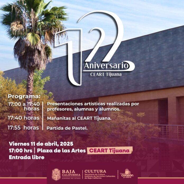 TIJUANA BC, 09 de abril de 2025. – El Centro Estatal de las Artes Tijuana (CEART Tijuana) celebrará su 12 Aniversario el próximo viernes 11 de abril, a las 17:00 horas, con un programa artístico gratuito para toda la comunidad, dio a conocer el coordinador de la institución Jorge Domínguez Cerda.