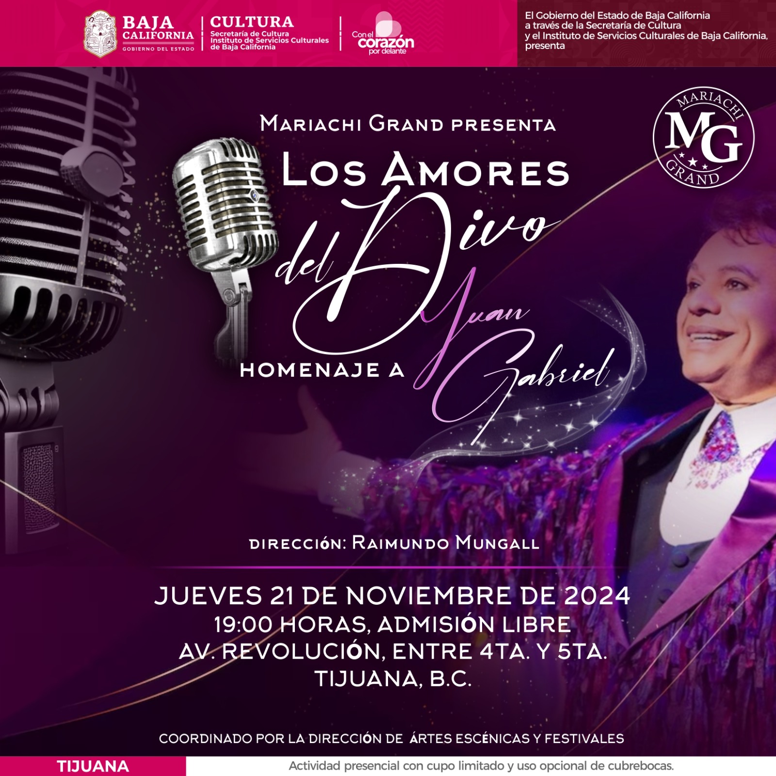 TIJUANA BC, 14 de noviembre de 2024.- Con el objetivo de fortalecer el impacto positivo de la cultura en el desarrollo social, creando oportunidades de expresión y unión en la comunidad tijuanense, el Instituto de Servicios Culturales de Baja California encabezado por Alma Delia Ábrego Ceballos, rendirá homenaje al icónico cantautor mexicano Juan Gabriel con la presentación «Los Amores del Divo, homenaje a Juan Gabriel».