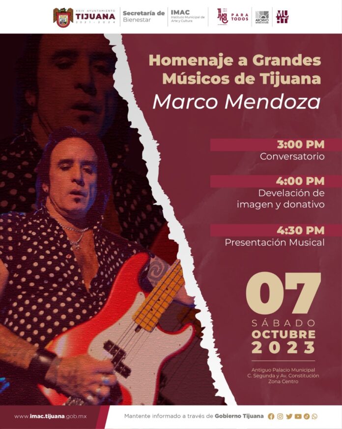 Marco Mendoza será incluido en la sala de exposición permanente del Museo de Historia de Tijuana. El evento dará inicio a las 15:00 horas con un conversatorio, a las 16:00 horas se develará una imagen, y posteriormente a las 16:30 horas se efectuará un concierto en el atrio del Antiguo Palacio Municipal. La entrada es libre.