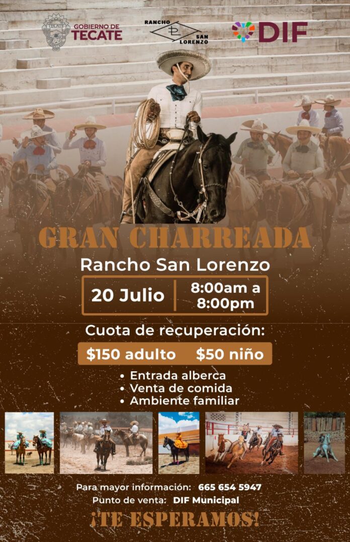 TECATE BC, 17 de junio de 2025. – Con el compromiso de seguir impulsando acciones en favor de quienes más lo necesitan, el Sistema para el Desarrollo Integral de la Familia (DIF) Tecate, en coordinación con el Rancho San Lorenzo, invita a toda la comunidad a ser parte de la Gran Charreada con causa, un evento familiar que se llevará a cabo el próximo 20 de julio de 8:00 de la mañana a 8:00 de la noche, en las instalaciones del rancho.