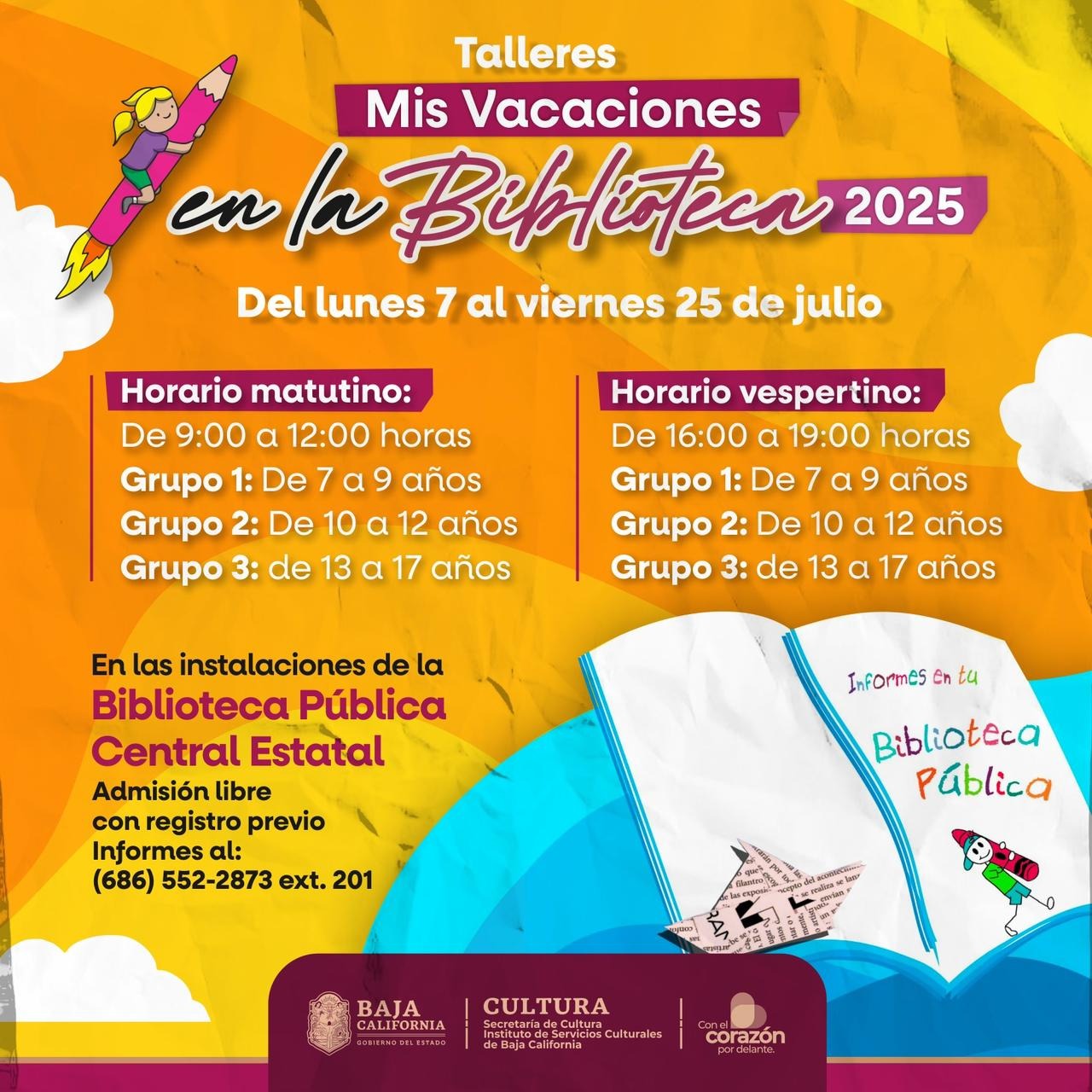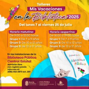 MEXICALI BC, 03 de julio de 2025. – El Gobierno del Estado de Baja California, a través de la Secretaría de Cultura, convoca a niñas, niños y adolescentes a participar en el programa Mis Vacaciones en la Biblioteca 2025, que se llevará a cabo del 7 al 25 de julio en la Biblioteca Pública Central Estatal y se replicará en las 94 bibliotecas que integran la Red Estatal de Bibliotecas en todo el estado.
