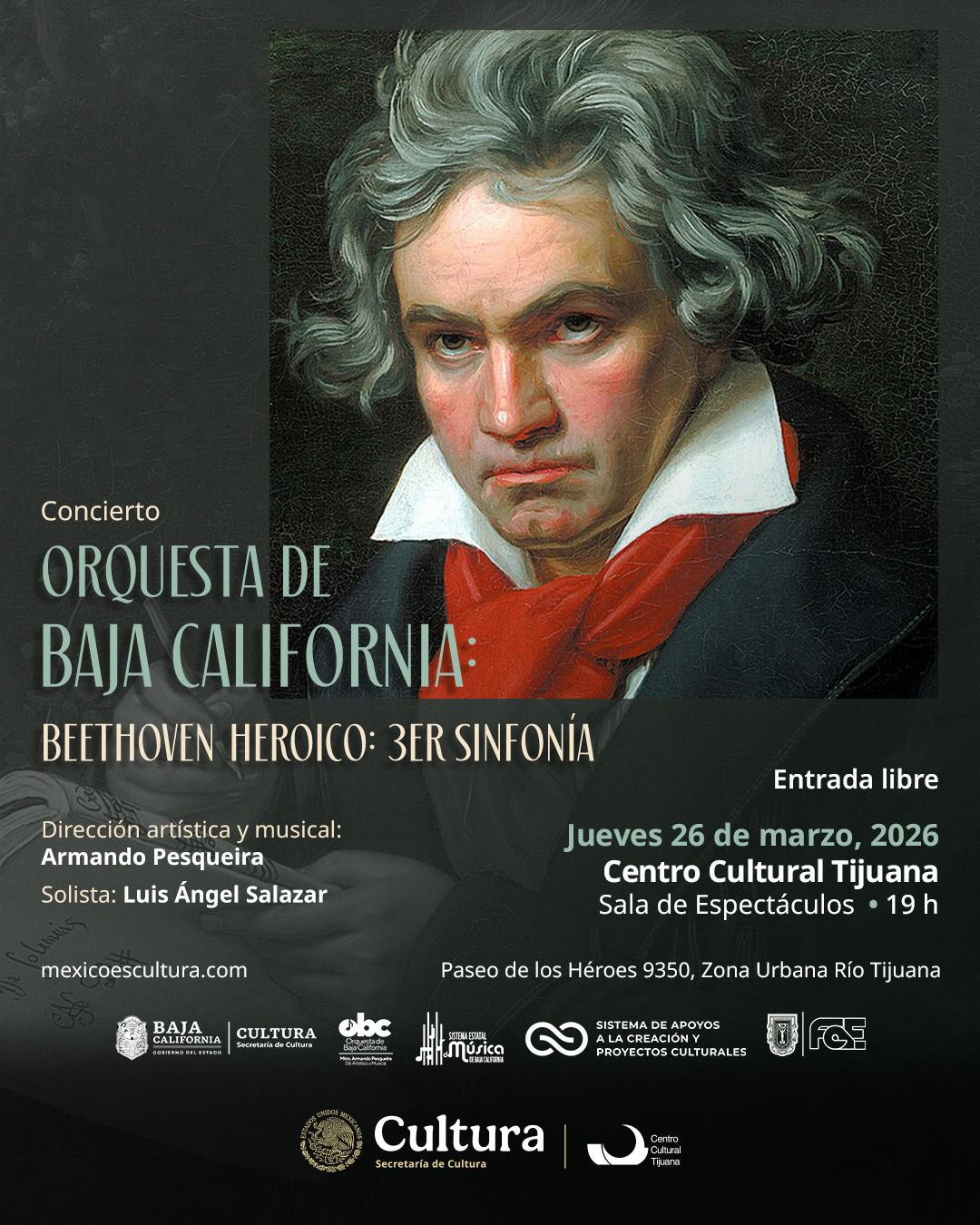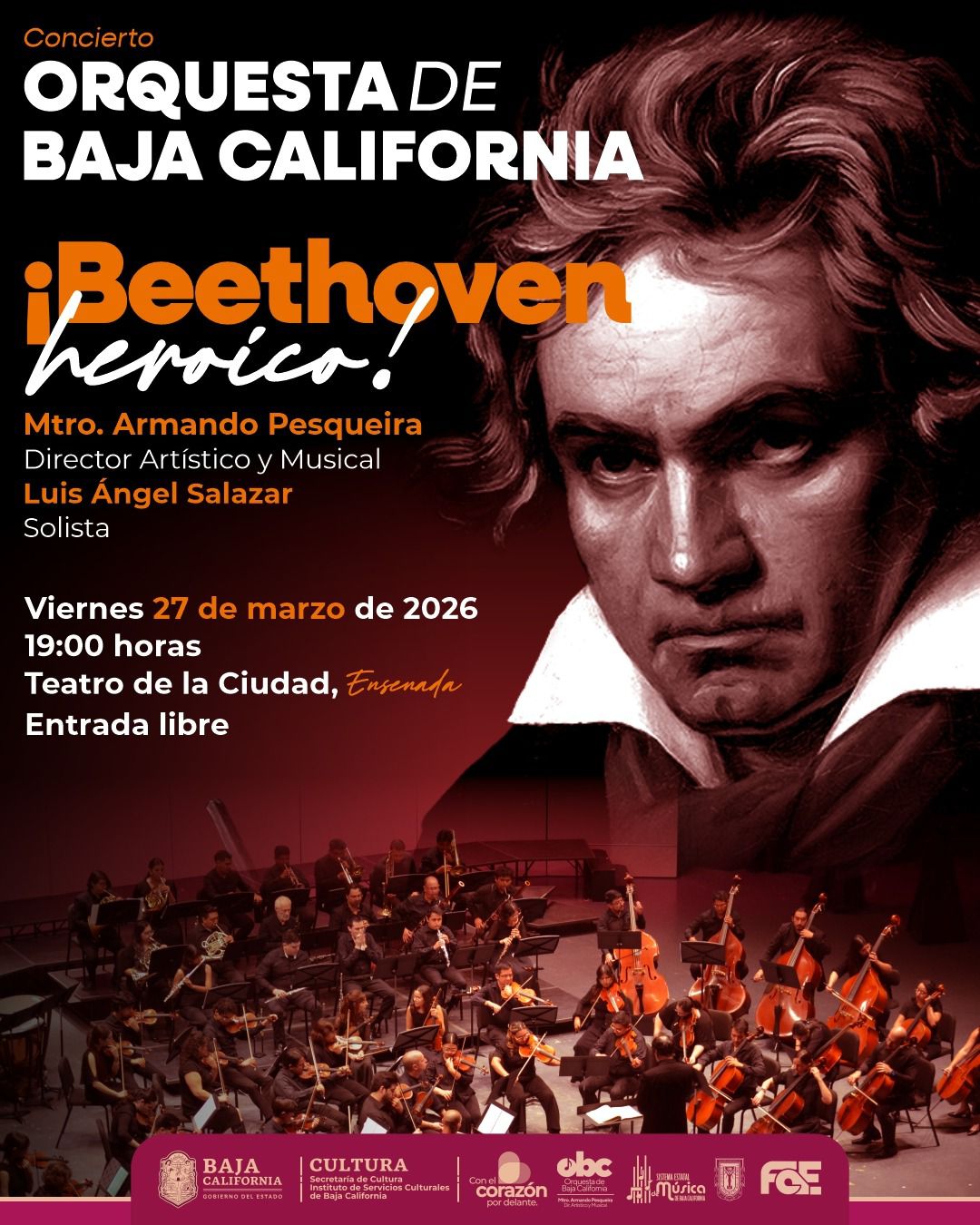TIJUANA BC, 23 de marzo de 2026.– El concierto “Beethoven Heroico: 3ª Sinfonía”, una de las obras más trascendentales del repertorio sinfónico universal, será interpretado por la Orquesta de Baja California (OBC) bajo la dirección artística y musical del maestro Armando Pesqueira.