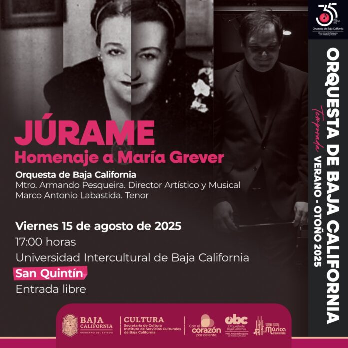 SAN QUINTÍN BC, 13 de agosto de 2025. –La Orquesta de Baja California (OBC) regresa a San Quintín como parte del Sistema Estatal de Música, con el concierto “Júrame”, un homenaje a la célebre compositora mexicana María Grever. El evento se llevará a cabo este viernes 15 de agosto a las 17:00 horas, en la Universidad Intercultural de Baja California, con entrada libre.