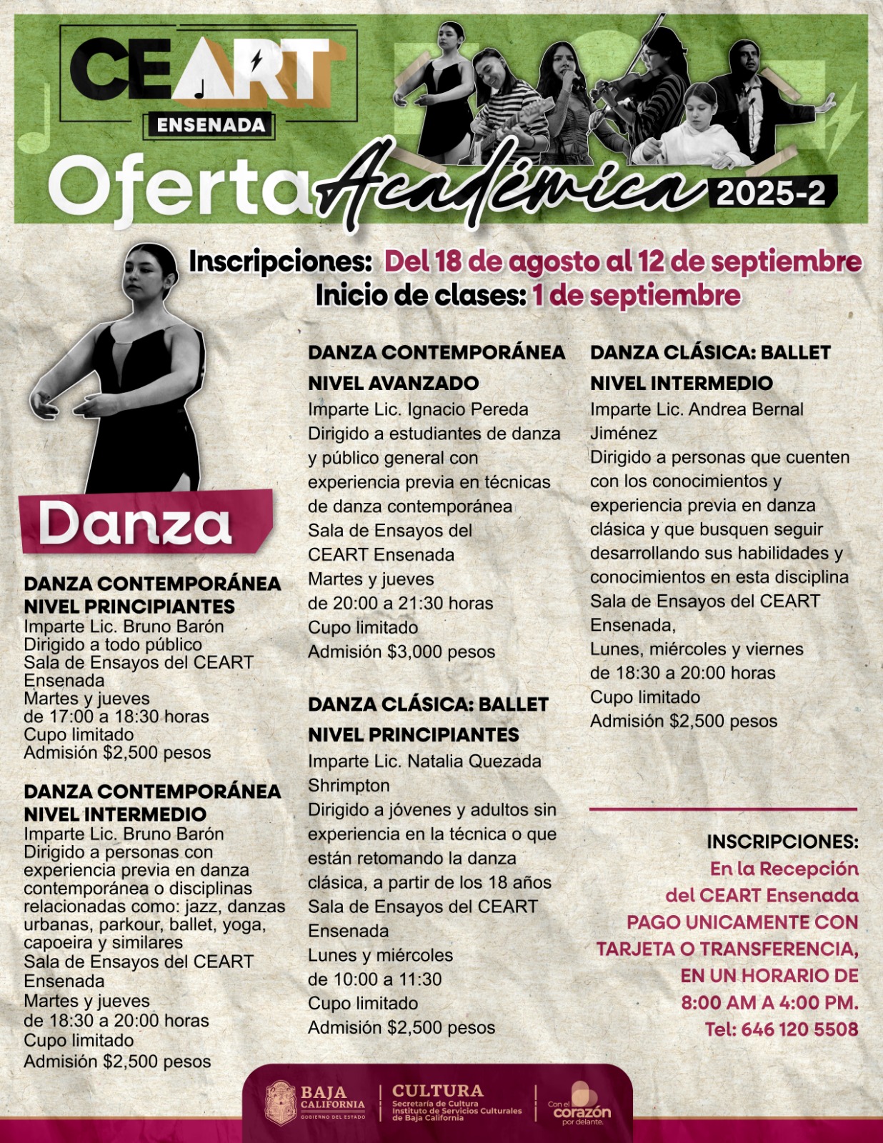 ENSENADA BC, 26 de agosto de 2025. -El Centro Estatal de las Artes´(CEART) Ensenada invita a la comunidad a integrarse a su Oferta Académica 2025-2, un programa que reúne talleres de artes plásticas y danza, impartidos por artistas y docentes de reconocida trayectoria en la comunidad cultural, con inscripciones abiertas hasta el 12 de septiembre.