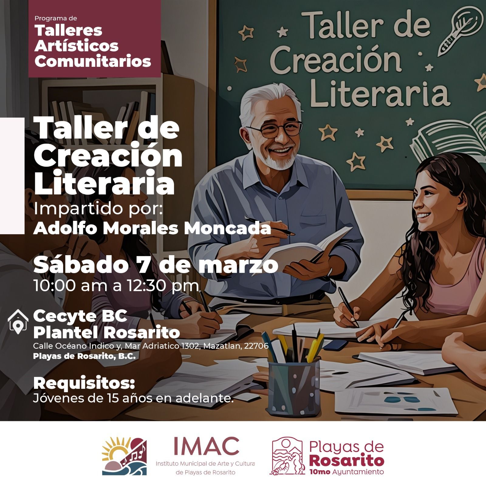 De igual forma, a partir del sábado 7 de marzo se llevará a cabo el Taller de Creación Literaria, impartido por Adolfo Morales Moncada en el Cecyte BC Plantel Rosarito. Dirigido a personas mayores de 15 años, tendrá una duración de cuatro meses con sesiones semanales, como parte del Programa de Talleres Artísticos Comunitarios, con el propósito de impulsar la expresión creativa y la formación con constancia académica.