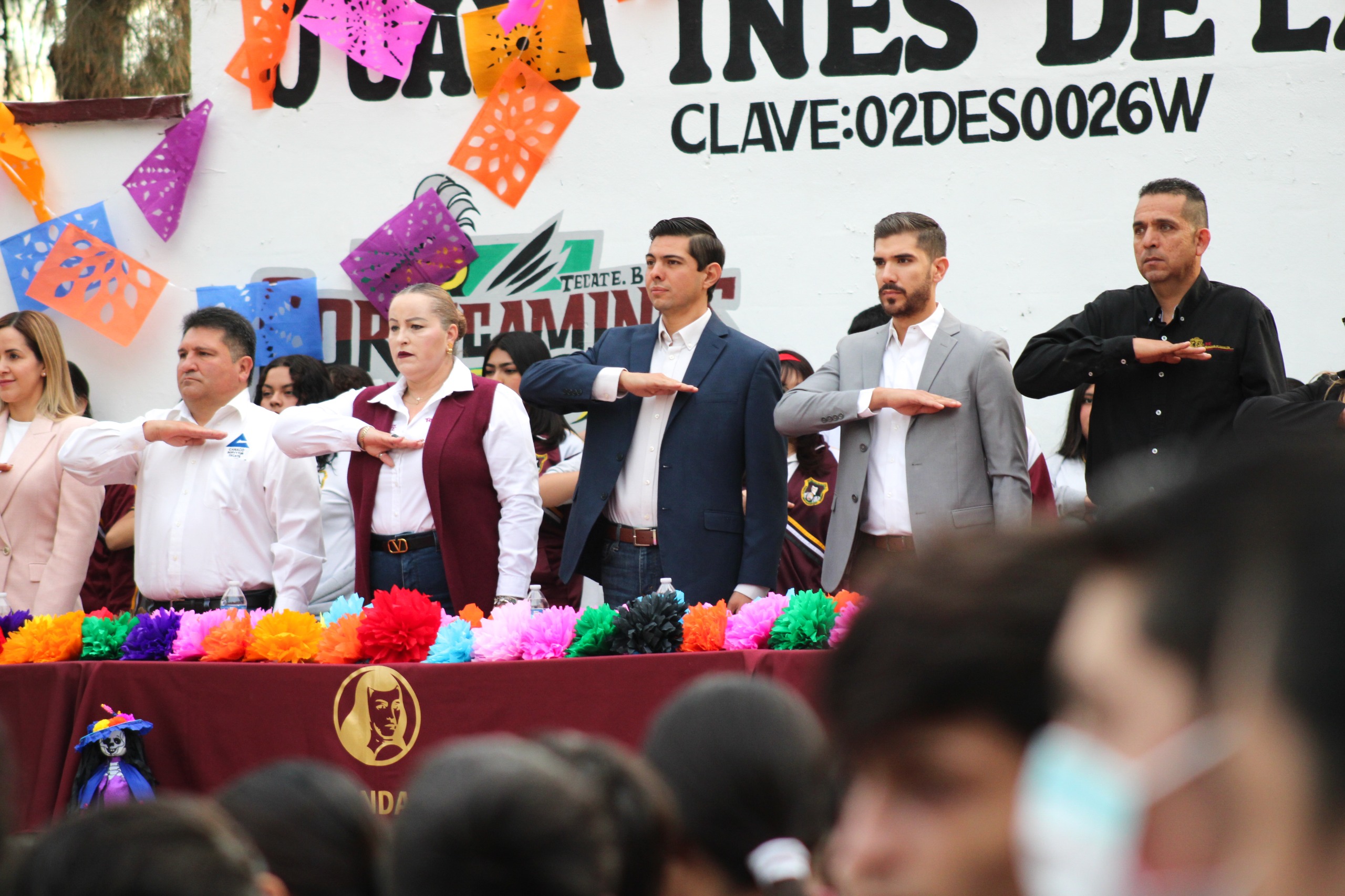En la ceremonia de honores a la bandera asistieron Dora Nidia Ruiz Chávez, secretaria del XXV Ayuntamiento de Tecate; Marisol Briseño, directora de Desarrollo Económico; Joel Vásquez, director de Desarrollo Rural; Jorge Luis Rodríguez, presidente de la Cámara Nacional de Comercio (CANACO) de Tecate; el regidor Isaac Contreras; la regidora María Quijada; el director del plantel, César Rico, además de representantes de la Sociedad de Madres y Padres de Familia.