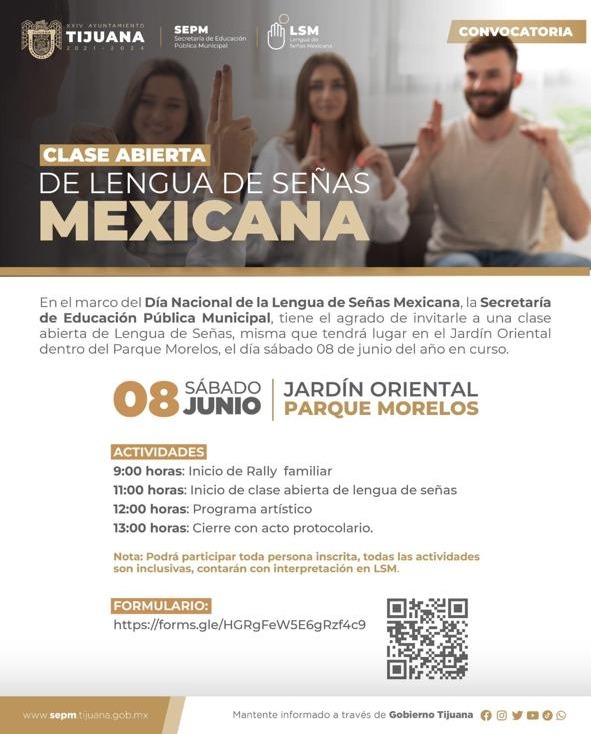 TIJUANA BC, 29 de mayo de 2024.- Con el objetivo de eliminar las barreras de comunicación entre las personas sordas y oyentes, además de fomentar la inclusión en todos sus aspectos, la Secretaría de Educación Pública Municipal (SEPM), llevará a cabo una clase abierta de Lengua de Señas Mexicana (LSM).