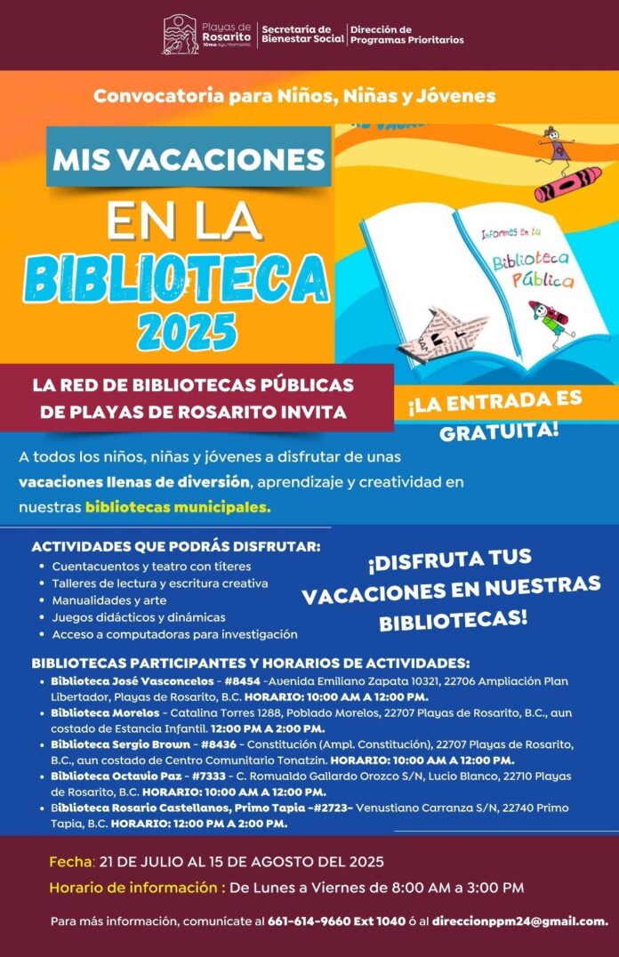 PLAYAS DE ROSARITO BC, 26 de junio de 2025.- Con el propósito de fomentar el aprendizaje, la creatividad y el aprovechamiento del tiempo libre durante el receso escolar, el 10° Ayuntamiento de Playas de Rosarito, que encabeza la Mtra. Rocio Adame, invita a niñas, niños y jóvenes a participar en el programa “Mis Vacaciones en la Biblioteca”, a realizarse del 21 de julio al 15 de agosto de 2025 en distintas bibliotecas públicas del municipio.