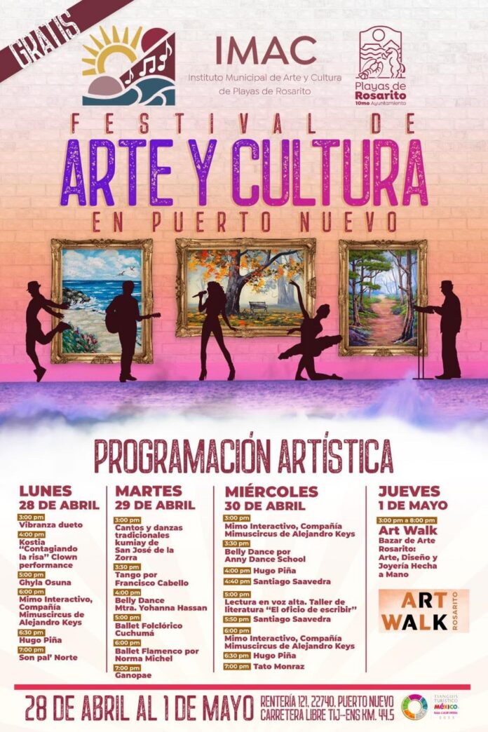 PLAYAS DE ROSARITO BC, 24 de abril de 2025.- El X Ayuntamiento de Playas de Rosarito, extiende una cordial invitación a toda la comunidad para disfrutar del vibrante «Festival de Arte y Cultura en Puerto Nuevo», que se llevará a cabo del 28 de abril al 1 de mayo del presente año. Este evento especial se enmarca dentro de las actividades del Tianguis Turístico 2025 y ofrecerá una experiencia cultural única para residentes y visitantes.