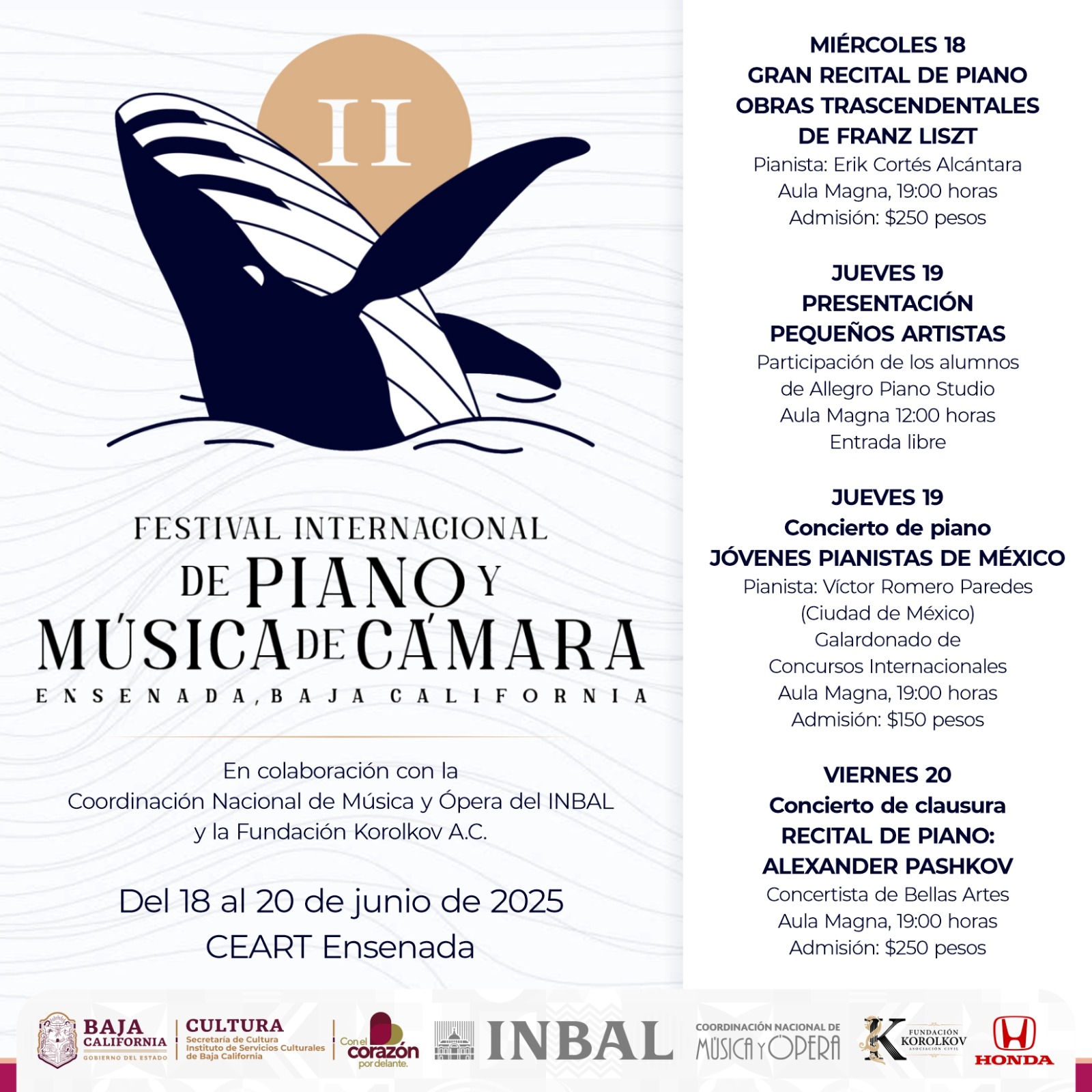 Todas las actividades se realizarán en el Aula Magna de CEART Ensenada. Se invita al público a consultar las redes sociales de la Fundación Korolkov A.C. y CEART Ensenada para conocer los costos de entrada y más detalles sobre esta celebración musical.