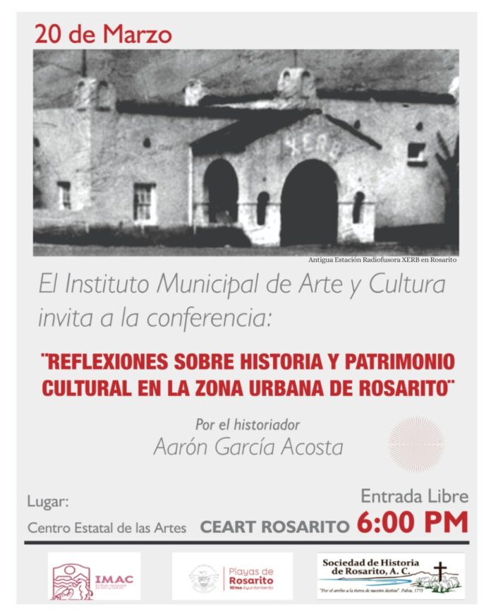 PLAYAS DE ROSARITO BC, 18 de marzo de 2025.- El Instituto Municipal de Arte y Cultura (IMAC) del quinto municipio, en colaboración con la Sociedad de Historia de Rosarito, A.C., extiende una cordial invitación a la comunidad para asistir a la conferencia titulada «Reflexiones sobre Historia y Patrimonio Cultural en la Zona Urbana de Rosarito». Esta interesante charla será impartida por el reconocido historiador Aarón García Acosta.