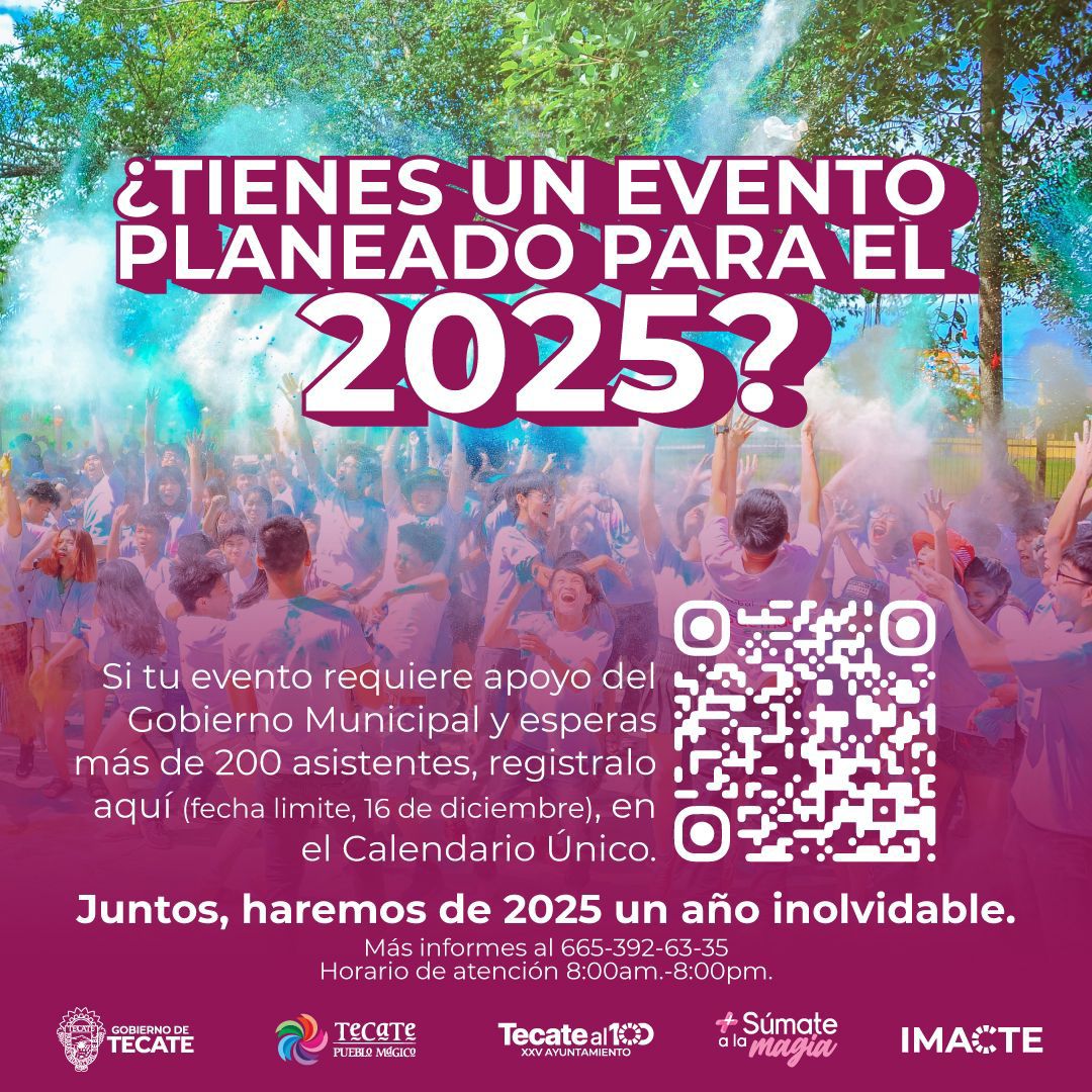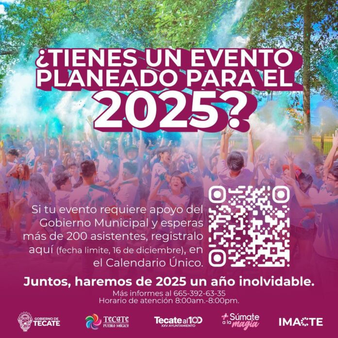 TECATE BC, 12 de diciembre de 2024.- Este lunes 16 de diciembre es la fecha límite para la inscripción al Calendario Único de Eventos 2025 que el Gobierno de Tecate a través del Instituto Municipal de Arte, Cultura y Turismo (IMACTE) está integrando para fortalecer la promoción de actividades que fomenten el turismo y enriquezcan la vida cultural del municipio. Para ello, el titular del Instituto, Alfredo Ochoa Álamos, hace un llamado a las diversas entidades y dependencias de los tres órdenes de gobierno, iniciativa privada y agrupaciones de la sociedad civil a inscribir sus eventos en este Calendario Único que busca centralizar y coordinar los eventos que se llevarán a cabo en espacios públicos para facilitar su organización y garantizar su éxito. Los eventos que se incluyan en el calendario deberán superar la estimación de 200 asistentes y requerir apoyo directo de las autoridades municipales, a fin de proporcionar una mayor difusión y apoyo logístico desde difusión, monitoreo de seguridad, bomberos y protección civil, cierre vehicular, tránsito, recolección de basura, servicios generales, alumbrado público, talleres, entre otros servicios generales necesarios. La inscripción deberá realizarse a través del siguiente enlace: https://docs.google.com/forms/d/e/1FAIpQLSfdUEejVCNINsSHLriIVvM5mllerlj99ArItJXbsqN1DzvAPw/viewform con fecha limite este lunes 16 de diciembre. Para mayor información o dudas los interesados pueden comunicarse al teléfono (665) 392 6335, en un horario de atención de 8:00 a 20:00 horas.