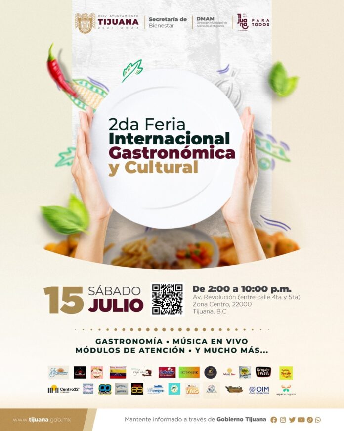 TIJUANA BC, 14 de Julio del 2023.- En cumplimiento de su compromiso por apoyar a la comunidad migrante y refugiada de Tijuana, el XXIV Ayuntamiento de Tijuana que encabeza la alcaldesa Montserrat Caballero Ramírez, realizará este sábado 15 de julio la 2da Feria Internacional, Gastronómica y Cultural en la Avenida Revolución.