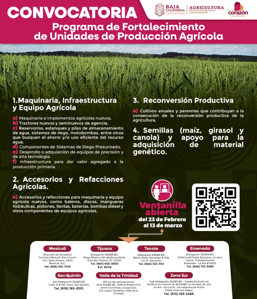 Para mayor información, las y los interesados pueden consultar la página oficial www.saderbc.gob.mx en el apartado de convocatorias, donde encontrarán bases, requisitos y detalles de cada programa.