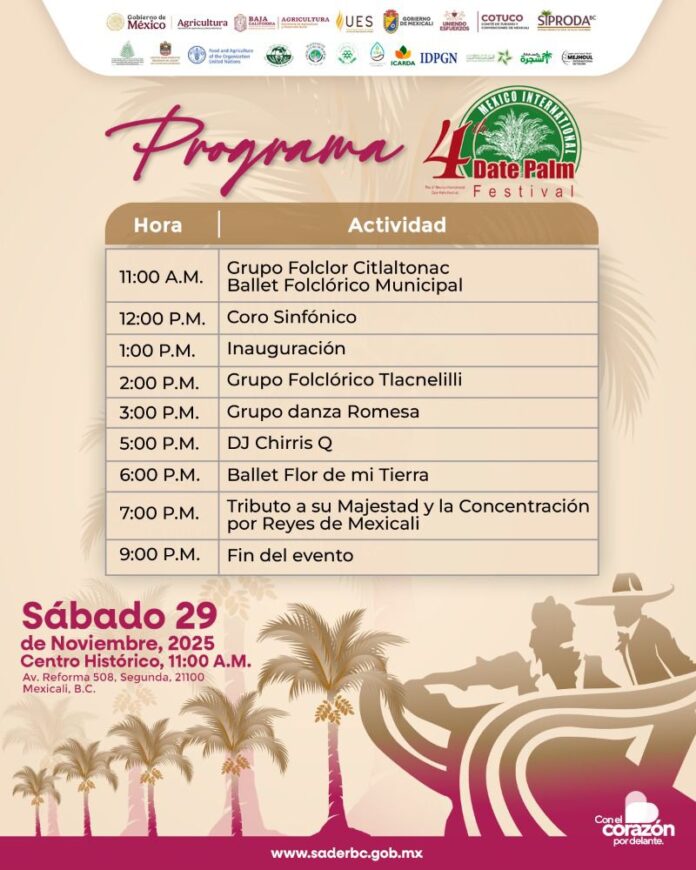 El festival se llevará a cabo el sábado 29 de noviembre, a partir de las 11:00 de la mañana, en el Centro Histórico de Mexicali, con actividades culturales, gastronómicas, exhibición de productos derivados del dátil y espacios de encuentro para productores.