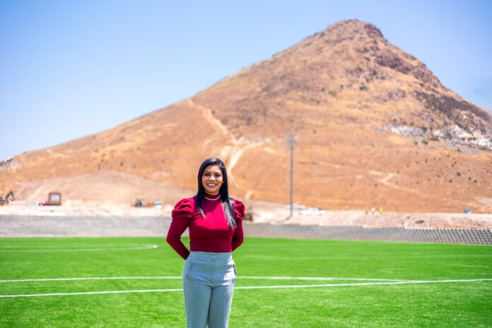 “Esto es solo una muestra, una cancha con pasto sintético, va muy avanzada, ya están los trabajadores poniendo las gradas donde vas a venir a ver a tus hijos, donde te vas a sentar en primera fila, en unas instalaciones de primer nivel, esta cancha también tendrá un skate park, si a tu hijo le gusta la patineta, es un excelente deporte”, señaló la Alcaldesa, durante un recorrido por el área donde se desarrolla este importante proyecto.