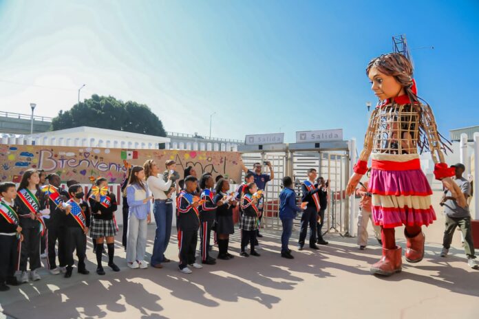 TIJUANA BC, 06 de noviembre de 2023.- La mañana de este lunes 06 de octubre entró a México la marioneta gigante Amal, por la puerta de la esquina del mundo que es Tijuana.