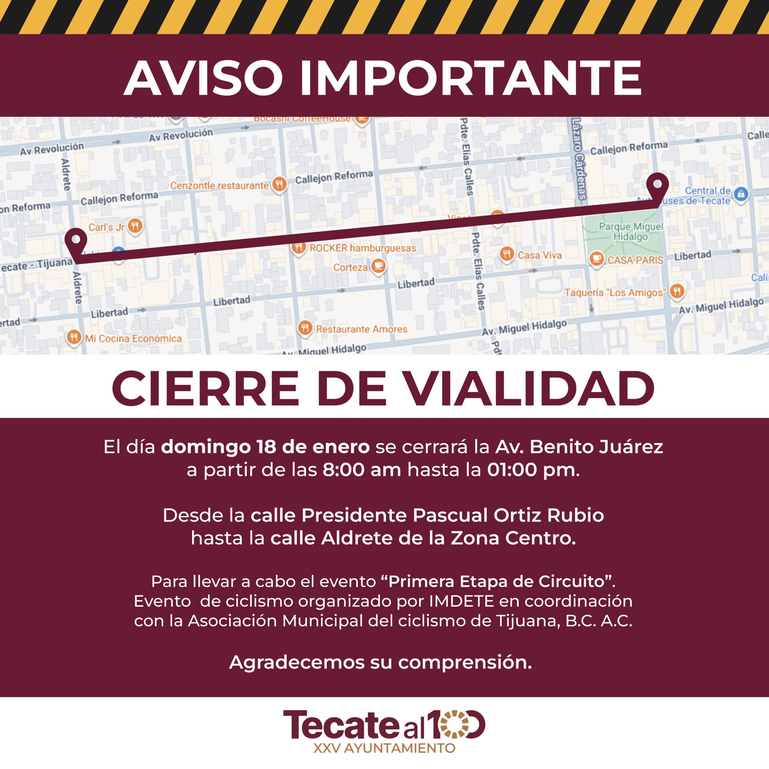 Tecate. – El Gobierno de Tecate informó que este domingo 18 de enero, la avenida Benito Juárez permanecerá cerrada a la circulación vial durante la mañana, debido a la realización de la competencia deportiva “Primera Etapa de Circuito”.