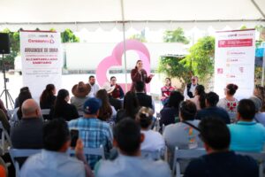 La mandataria estatal encabezó el banderazo de arranque de obra, así como la develación del pedestal que simboliza la primera piedra de la construcción de la Planta de Tratamiento de Aguas Residuales, que beneficiará a la comunidad.