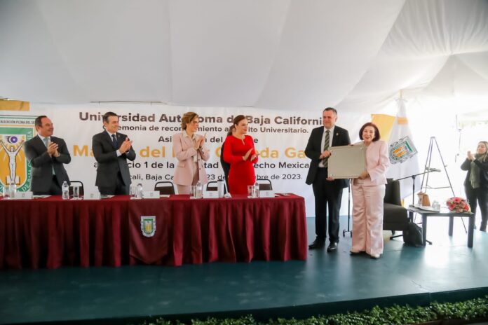 MEXICALI BC, 23 de noviembre de 2023.- La gobernadora de Baja California, Marina del Pilar Avila Olmeda, se unió al reconocimiento que hizo la Universidad Autónoma de Baja California (UABC) a la Dra. Marina del Pilar Olmeda García, al nombrar un edificio de la Facultad de Derecho en su honor.