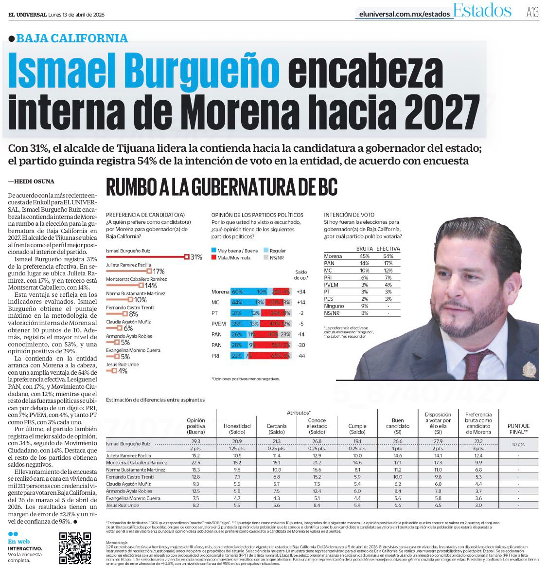 CIUDAD DE MÉXICO, 13 de abril de 2026.- El alcalde de Tijuana, Ismael Burgueño Ruiz, se coloca como el aspirante mejor posicionado dentro de Morena para la gubernatura de Baja California en 2027, de acuerdo con la más reciente encuesta de Enkoll realizada para El Universal.