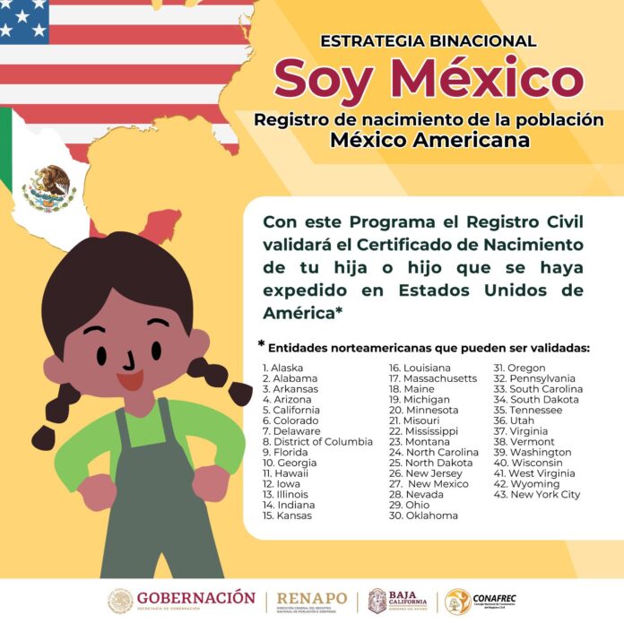 MEXICALI BC, 15 de agosto de 2024.- Con el objetivo de facilitar el registro de actas de nacimiento de niñas, niños y personas mayores de edad México-Americanas, garantizando así su identidad en Baja California, es que el día de hoy inició este 15 de agosto la campaña “Soy México” 2024,