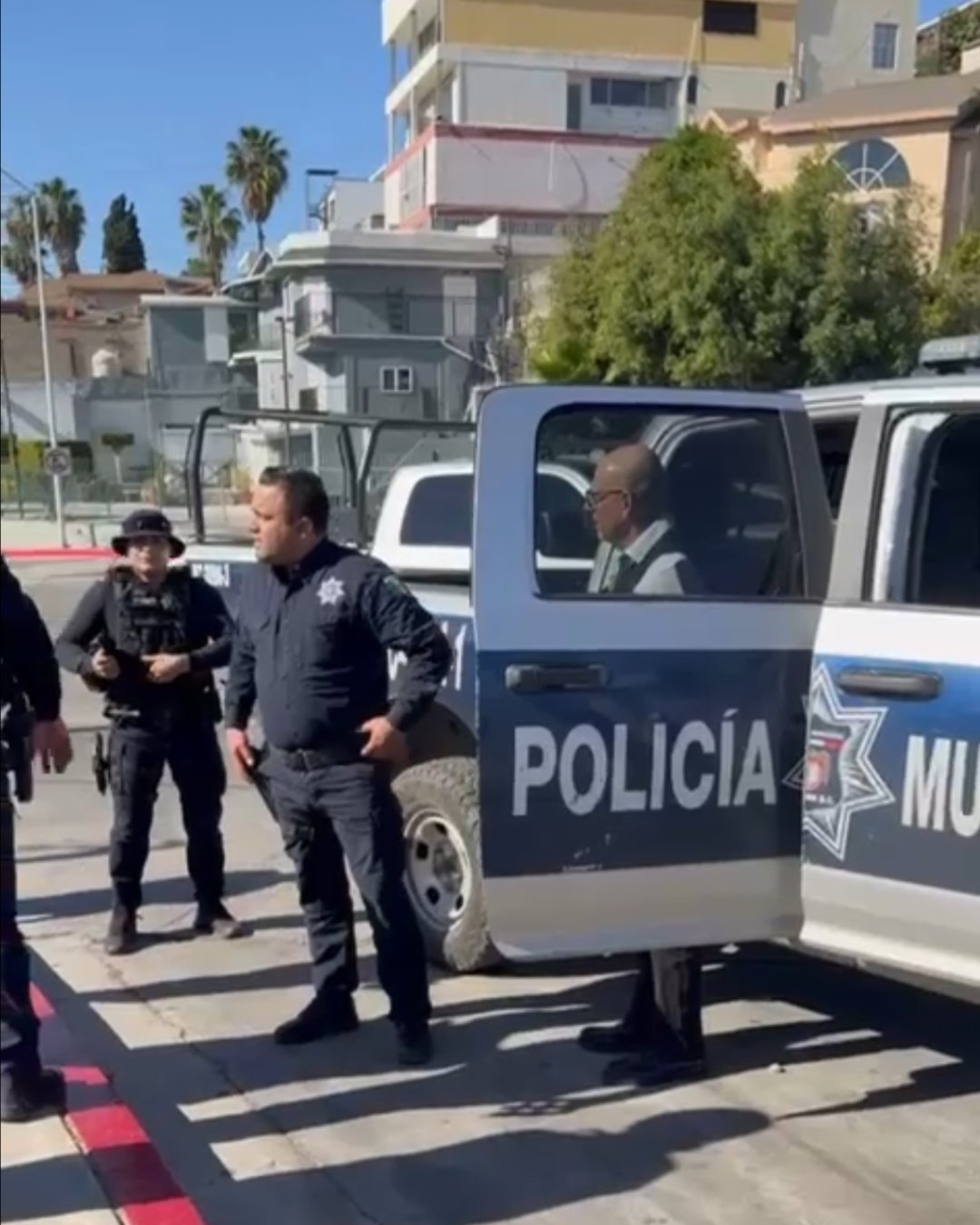 TIJUANA BC, 17 de febrero de 2026.- Los dos policías municipales vinculados a las agresiones físicas y verbales propinadas a Héctor Riveros y a Olivaldo Paz,  vicepresidente y presidente de la Cámara Nacional de Comercio delegación Tijuana respectivamente, fueron suspendidos de manera preventiva por presuntas faltas al Reglamento de Servicio Profesional de Carrera y Seguridad Social de la Secretaría de Seguridad y Protección Ciudadana Municipal.