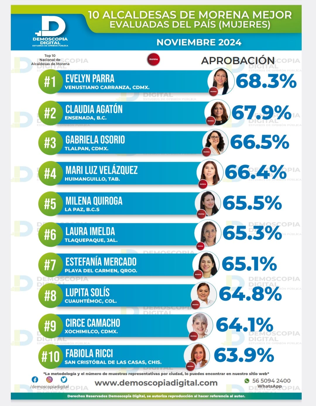 Cabe destacar que, Morena avala la misma evaluación que ubica a Claudia Agaton Muñiz como la alcaldesa mujer mejor evaluada en el país en el 7mo lugar nacional.
