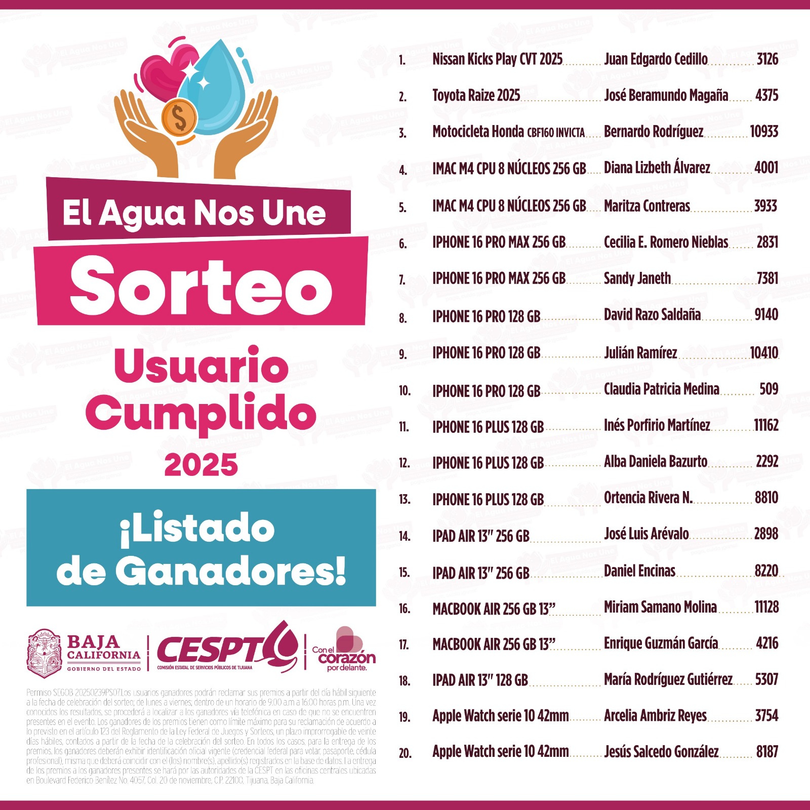 TIJUANA BC, 31 de marzo de 2026.- La Comisión Estatal de Servicios Públicos de Tijuana (CESPT) dio a conocer a las y los ganadores del Sorteo “El Agua Nos Une: Usuario Cumplido 2025”, iniciativa que reconoce a quienes mantienen al corriente el pago de su recibo de agua.